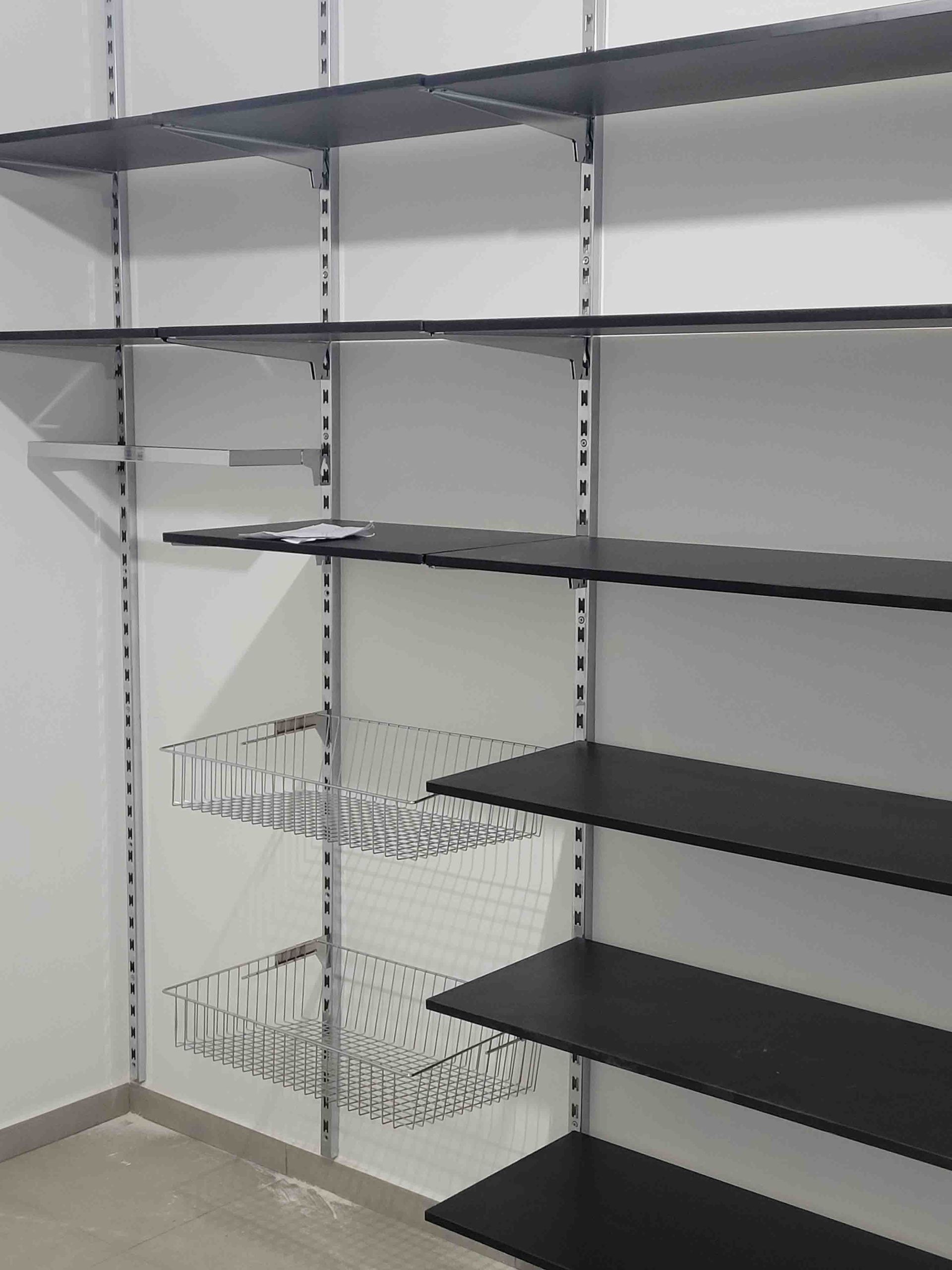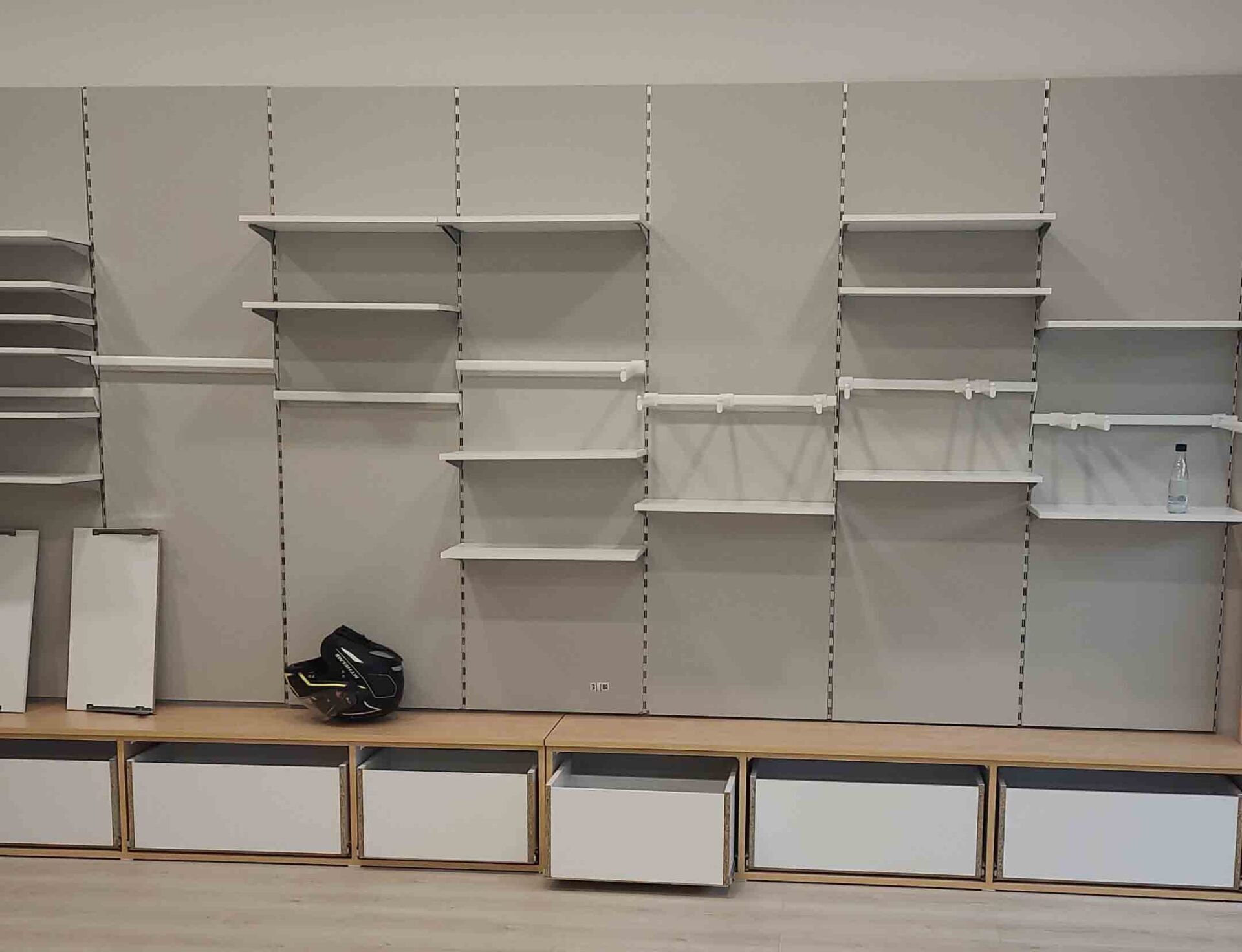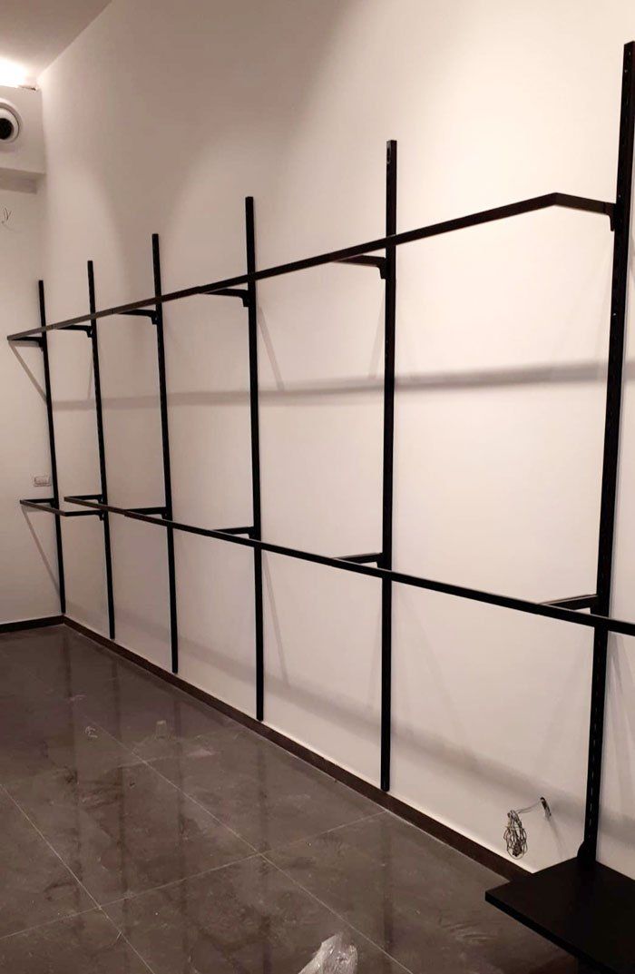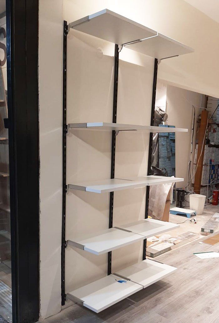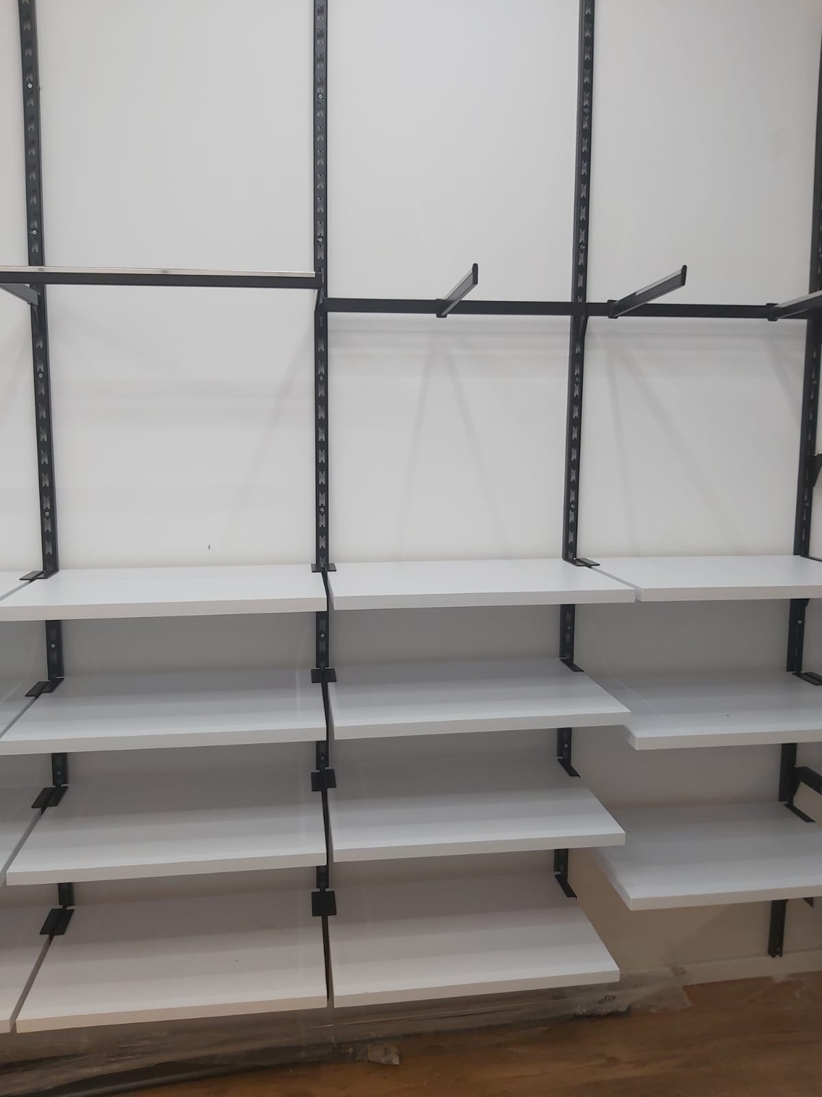 מערכת מידוף לחנות זו הינה מודולרית ומיועדת להתקנה על הקיר בלבד, ומהווה פתרון פשוט ויעיל לבית עסק שלכם. ללא קונסטרוקציות בנייה נוספות, ניתן לשלב בה מדפי עץ\זכוכית וחת תלייה. מערכת מידוף זו יכולה לשמש גם לדירות כחדר ארונות.